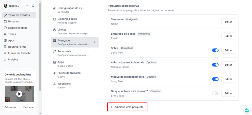 10. Na seção Perguntas Sobre Reserva, na parte inferior, clique em Adicionar uma Pergunta.
