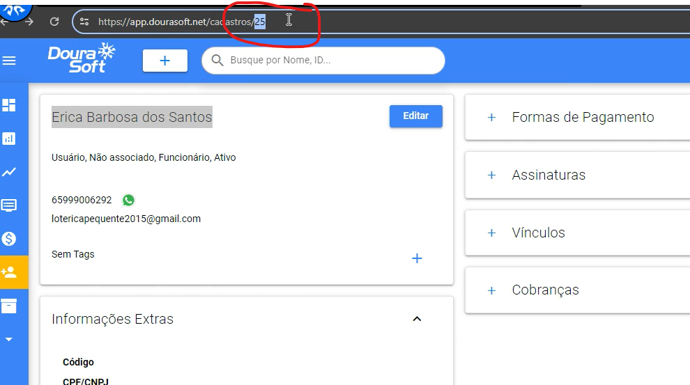 - Abra a página do cadastro responsável no sistema e localize o ID na URL presente no navegador.