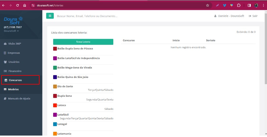 - Na tela do Portal do Admin, identifique à esquerda todas as loterias disponíveis.