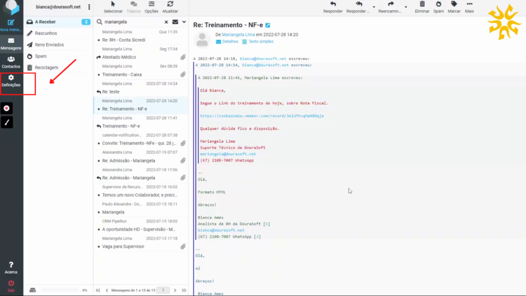 Primeiramente, acesse seu e-mail na plataforma Roundcube Webmail e acesse o menu Definições ao lado esquerdo da tela: