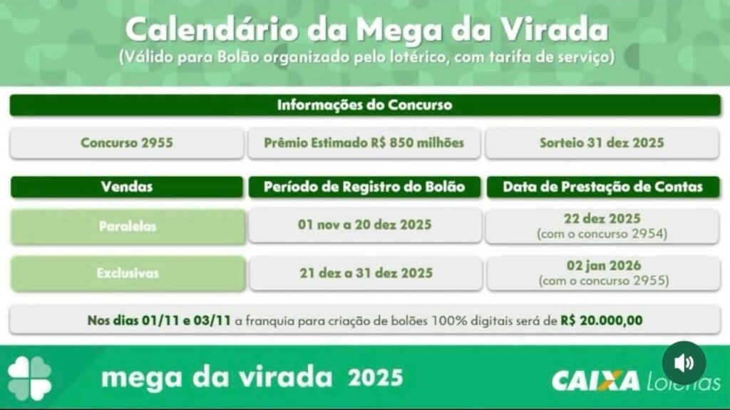 - Os BOLÃO – Mega-Sena da Virada concurso 2955, organizados pela lotérica, com tarifa, que forem registrados entre os dias 01/11/2025 e 20/12/2025, serão debitados no dia 22/12/2025 junto com o concurso 2954.